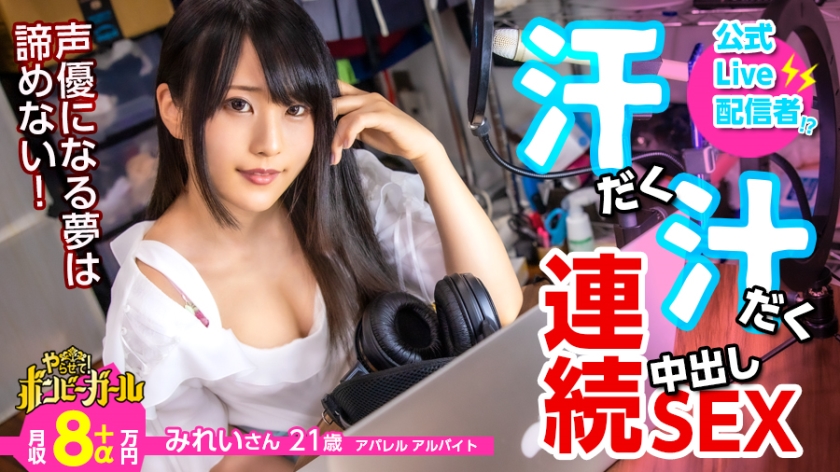 某雑誌のアンケート調査によると、10~30代女性の72%が「お金がない」と回答!3人に1人がいわゆる「ボンビーガール」なのである!そんなボンビーガールたちをリアル調査し、彼女たちの生活感、恋愛観、夢なんかを聞いたりしながら、なんだかんだでセックスまで撮らせてもらう!そんな企画「やらせて!ボンビーガール」!貧乏生活を送りながら、彼女たちはどう生きているのだろうか…【報告レポート】今回は池袋でボンビーさんを探します。本日撮影に協力してくれたのは清楚な雰囲気が魅力的なみれいさん。池袋駅から少し離れた賃貸にお住まいの彼女、早速冷蔵庫の中などを確認すると自炊はしっかりしているご様子。部屋にはコスプレの衣装がずらりと並び配信用の道具も揃えて中々多趣味な様です。声優になるのが夢だというみれいさん。金銭面の問題で養成所に通う事が出来ず、独学で声優になる為の勉強をしているそうです。ファンから欲しい物リストで贈り物が届くそうで部屋には段ボールが何個もあるので中を確認してみるとバイブを発見。性欲が強いと配信で言ったらファンの方が送ってきてくれたそうで中々エッチなお姉さんの予感。そんなみれいさん、つい最近三年付き合った彼氏と別れたばかりで今は新しい彼氏を作る気は無いそう。寝室に案内して貰えば堂々と電マが置いてあり「普通ですよね(笑)!」と使い込まれた電マを見ながらニッコリ。おち○ち○欲しいなと思う事はよくあるそうなので撮影を交渉してみるとあっさり流されてくれました。パンティを脱がせて電マを当てればユラユラと腰を揺らしながらどんどん溢れてくる愛液。乳首を軽く摘んだだけでも大きく体を跳ねさせ感じている敏感体質です。男優のち○ぽを差し出せば口を大きく開けて根元まで咥えて無我夢中でフェラしてくれます。とろとろのおま○こを手マンで激しくかき混ぜればカメラをびしょびしょに濡らすほど潮を吹いて激しいピストンに何度も背をのけ反らせて感じていました。汗だくでカメラが曇る程濃厚なセックスを楽しんだみれいさん。最後は中出しでフィニッシュ…!出しちゃったの…?と放心状態で言った声がエロすぎて声優志望は伊達じゃありませんでした!